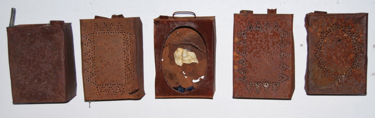 These old kerosene tins I collected and drilled holes into the surface to create an illusion of a picture frame. The central tin was found with an oval opening, and the ceramic face was found broken and in scattered pieces. I collected them up at Kirkalocka station in the north west of W.A. at the property’s ‘virgin’ tip site. It was a sculpture camp for W.A.C.I.T. Advanced Diploma students and lots of fun creating from found materials. 2012