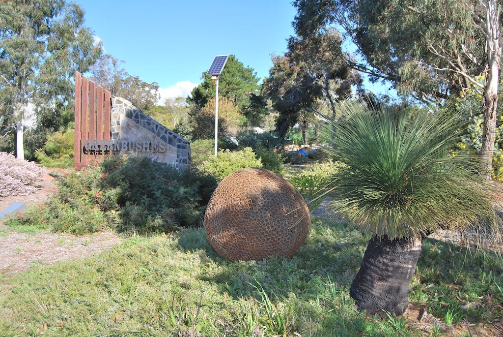 The Fireball was formed with recycled burnt fencing wire from my property in Greenbushes W.A. In Febuary last year we experienced a devastating fire on the property and surrounding area. The ball evokes the granite boulders that scatter the landscape. The image shows the sculpture in situ on exhibition at Greenbushes inaugural art walk exhibition in July 2013 – which aptly had a theme of Fire.