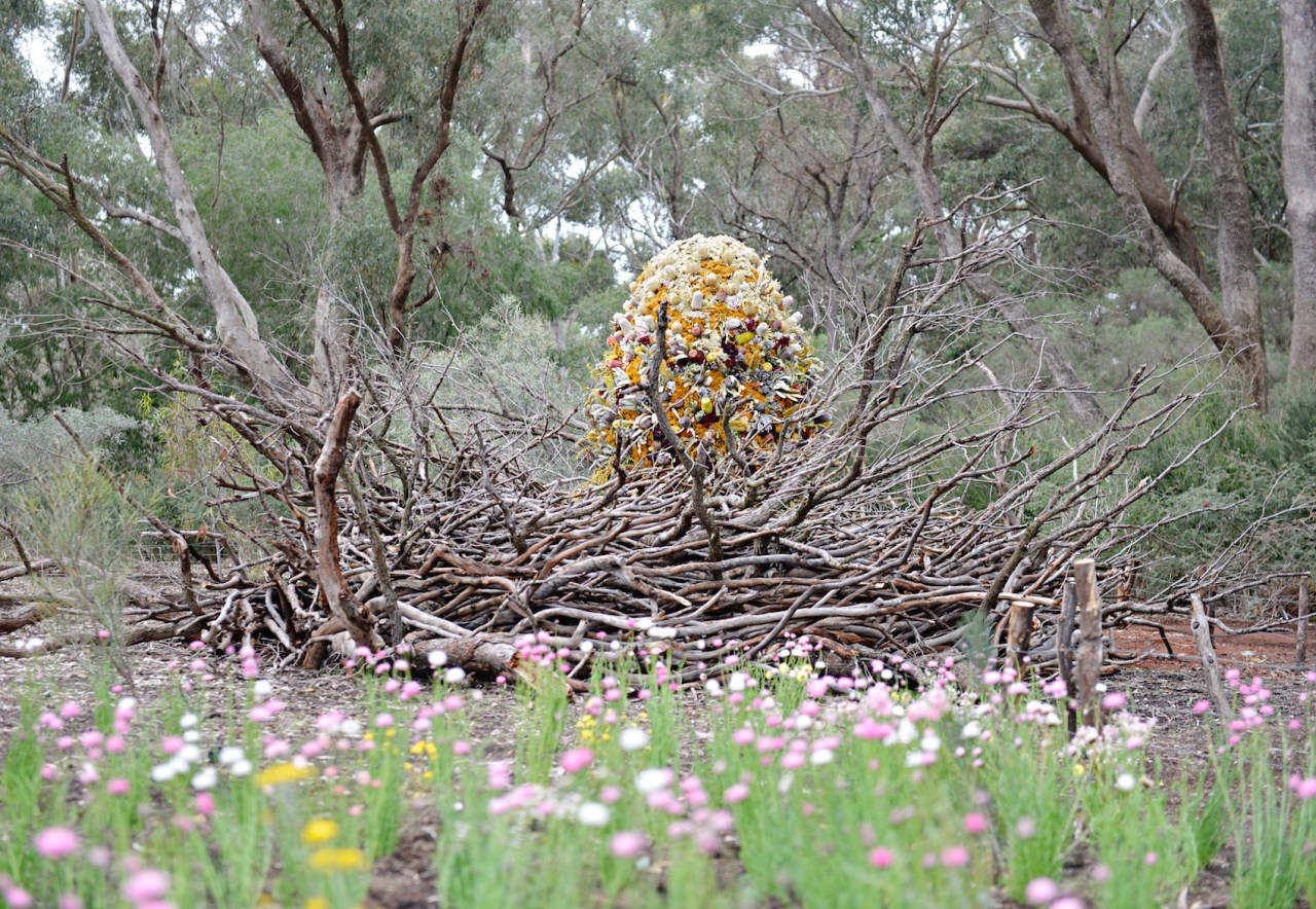 Woven Wildernest is an Ephemeral Art Work commissioned by BGKP in 2017 for the Wildflower Festival. It consists of a 6m nest created from an old jarrah tree felled at the site and many pallet loads of branches collected by the park. I created the nest and then placed the egg form into the carefully prepared footing. The egg was firstly formed from a welded steel framework which was then covered in a few layers of fencing wire to which fresh native flowers were inserted, highlighting the Kwongan Heath Plants of the southwest of Western Australia.