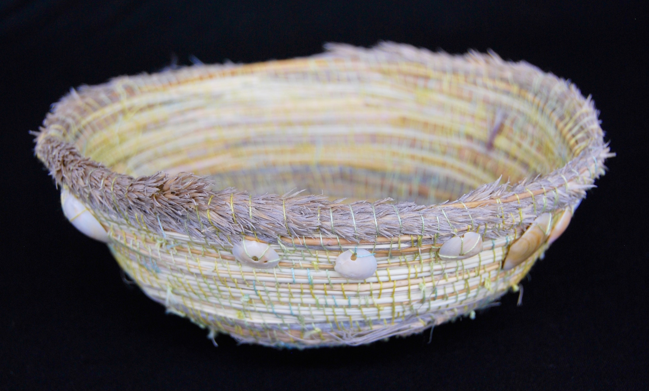 Eugarup beach basket, side view. 2016. Sally Stoneman Published October 13, 2017 at 2126 × 1282 Eugarup Beach Basket This basket was created over a couple of days spent camping on the beach at Eugarup. It documents the grasses and shells found there.